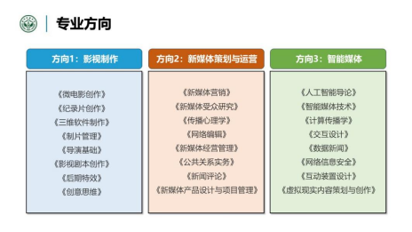本专业致力于培养具备网络与新媒体领域应用与创新能力的人才,分为三个专业方向:影视制作方向、新媒体策划与运营方向、智能媒体方向。