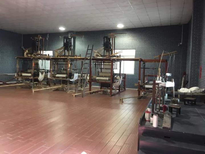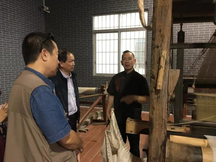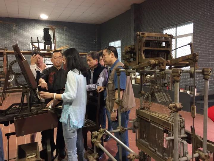 香云纱“非遗传承人”南海永鸿纺织有限公司总经理张绍景先生为中大新华艺术学院蔡院长、周院长一行人解说介绍香云纱织造步骤,交流香云纱织造与染整工艺。之后,赴西樵香云纱传承基地参观晒莨场地。