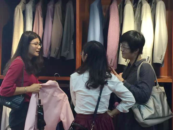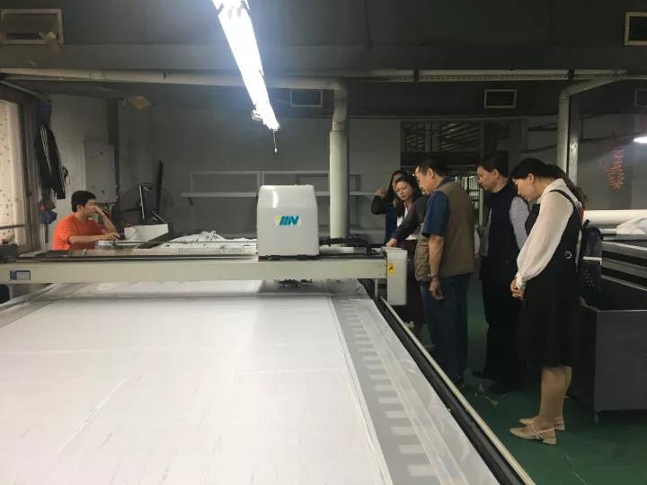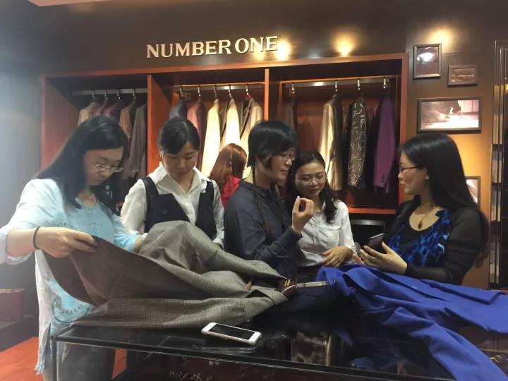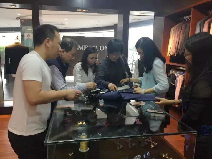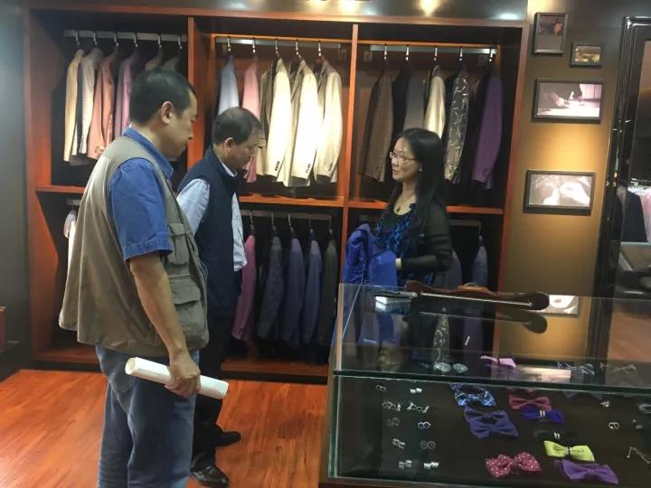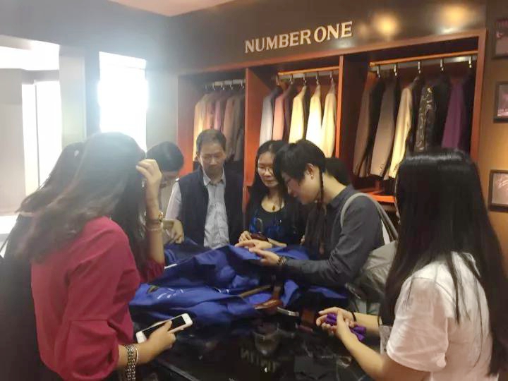 NO.1公司何颖斌总经理、麦耀棠副总经理以及企业部陈笑英主管接待蔡照波院长、周国屏副院长一行,老师们参观了壹哥高级西服定制展厅,学习、交流高级定制西服设计、制作等技艺,并考察西服、制服生产车间,参观打板、排料设备等。