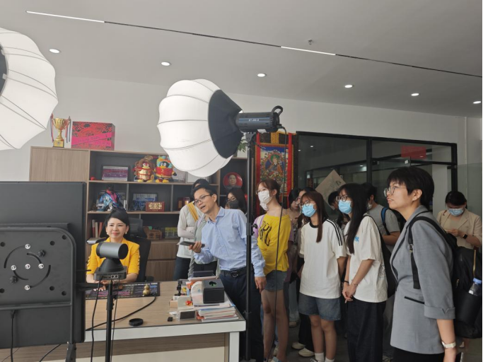 在参观完园区后,师生一行还重点观摩了领航直播学校的直播培训室,并与林显积副校长、何晓燕副校长就主播职业能力培养、直播间的搭建、直播设备配置与操作、直播选品等方面展开交流。学生们在林显积副校长的指导下进行试播,亲身体验直播的过程。
