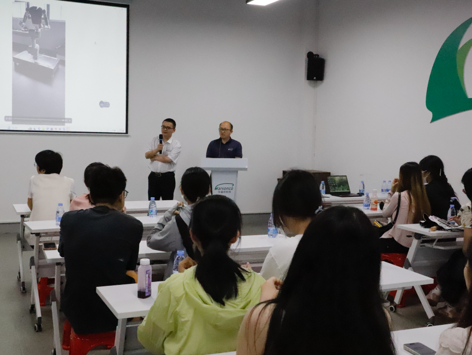 座谈交流中,华盛控营销中心肖发庚总监介绍了华盛控的发展历程、主营业务与未来规划,研发中心陈鑫工程师则重点讲解了企业在机器人技术与智能控制方面的核心研发成果。紧接着校企双方围绕“产教融合背景下的人才共育机制”展开交流并就设置实践性课程组织学生社会实践与实习等方向达成初步共识。