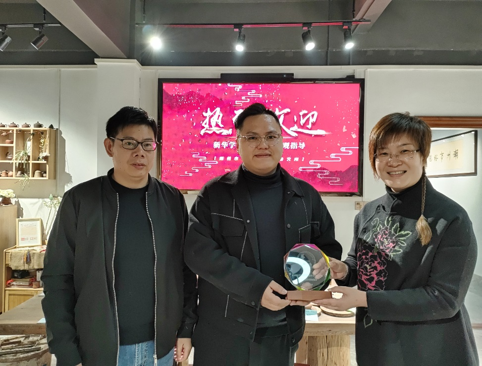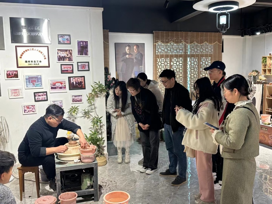 张泽锋校友是我院2014级校友,全国五一劳动奖章获得者、广东省五一劳动奖章获得者、高级工艺美术师、潮州市工艺美术大师,同时担任裕德堂壶艺研究所副所长。他热情地向母校老师介绍了裕德堂壶艺研究所的发展历史,分享劳动人的手艺故事,以及非遗技艺传承发展的点滴历程。他表示,研究所不仅凝聚了一群年轻人为古老非遗的传承而努力,同时,多元时尚元素的加持也吸引着一波波市民游客走近非遗、体验非遗、推广非遗。