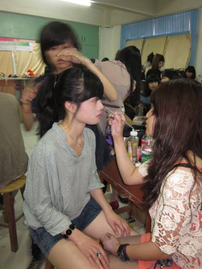 在前台光鲜亮丽的可爱人儿的背后,有一支默默付出的化妆小组队伍。他们给表演增添了美丽与期待!