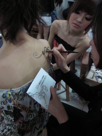 组员在为成果展的模特画人体彩绘。细致认真!