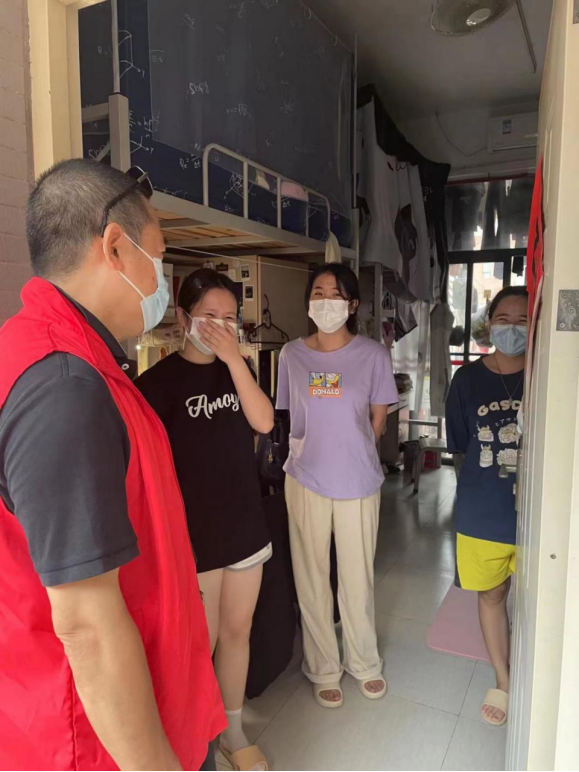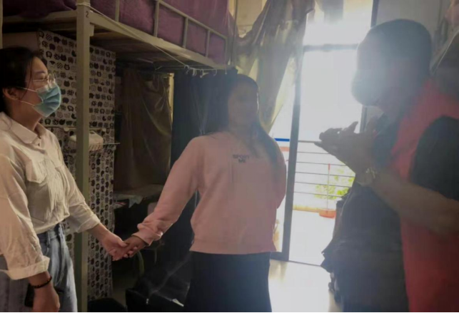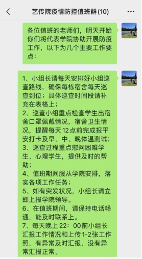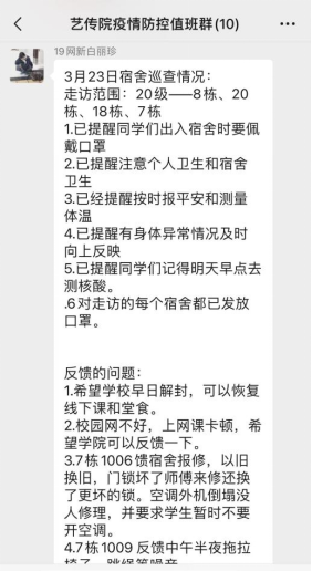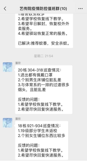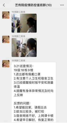 为了保证封闭期间学生学习、生活有序进行,及时掌握并了解同学们现状与需求,学院领导、辅导员、班主任和党团学干部共55人成立巡查小组,实行值班制度,全程、全方位、全覆盖深入186间学生宿舍,705名在校生,不漏“一间宿舍”,不漏“一人”,主动联系学生,关怀学生学习生活上的情况,了解学生难处并提供及时的帮助。在走访期间,同学们反馈最多的问题是线上上课没有线下氛围好,校园网络信号不好,上网课卡顿和驿站快递停止营业,希望能尽快恢复线下上课和快递服务。针对以上问题,值班小组详细记录,安抚学生情绪,鼓励克服困难,并把有关问题向上级反馈,落实改善。除此以外,心理问题学生、经济困难学生是学院重点关注的人群。