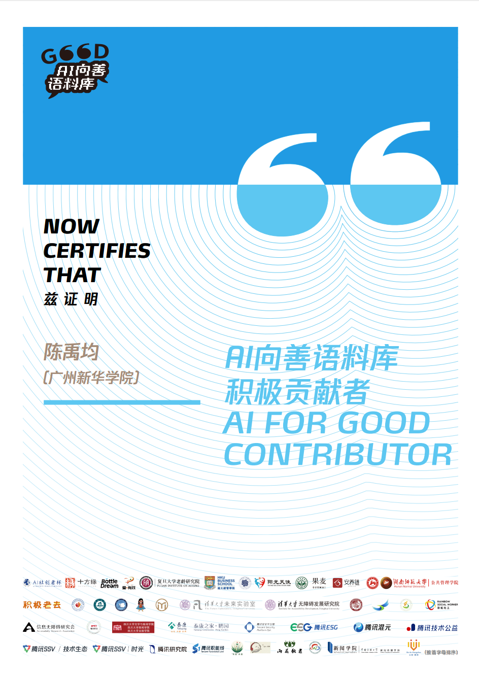 后续,近百名传播学专业的学生参与到“AI向善语料库”共创行动中去。传播学专业学生秉持着高度的责任感与使命感,深度参与到腾讯 AI 向善语料库的建设工作之中。他们充分发挥自身的专业优势,运用扎实的传播学理论知识与敏锐的洞察力,为语料库的丰富和完善贡献了大量宝贵的内容与创意。其中有68名传播学专业学生获得腾讯公司所颁发的“AI向善语料库积极贡献者”,受到腾讯公司的高度好评。