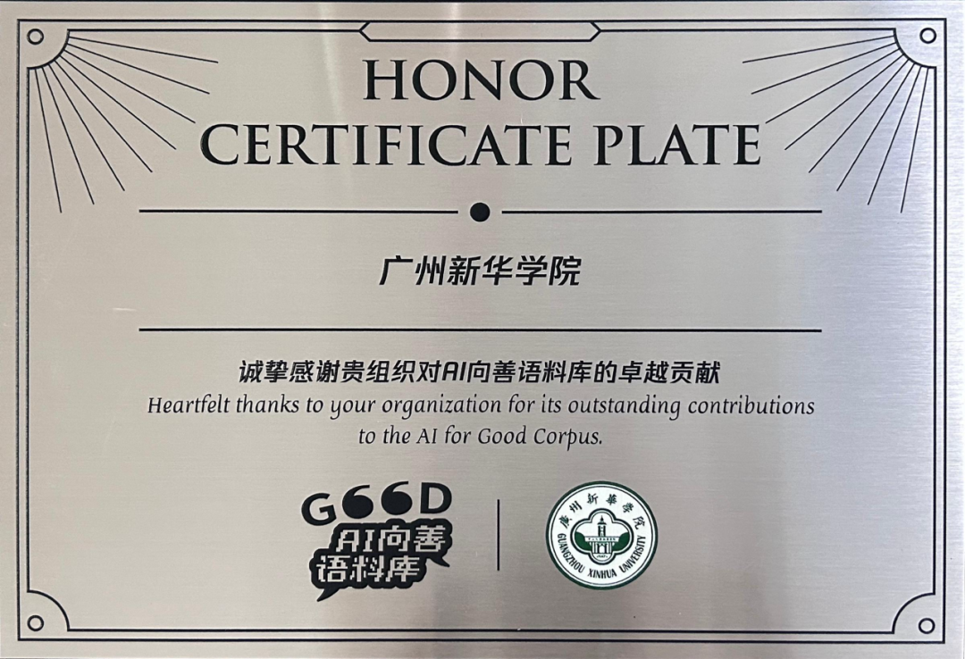 近期,广州新华学院传播学专业迎来了荣耀时刻——来自腾讯的 AI 向善语料库荣誉牌匾与纪念徽章正式授予该专业。这份荣誉不仅是对师生们过往努力的高度认可,更是对他们在推动科技向善进程中所展现出的卓越智慧与担当精神的有力见证。
