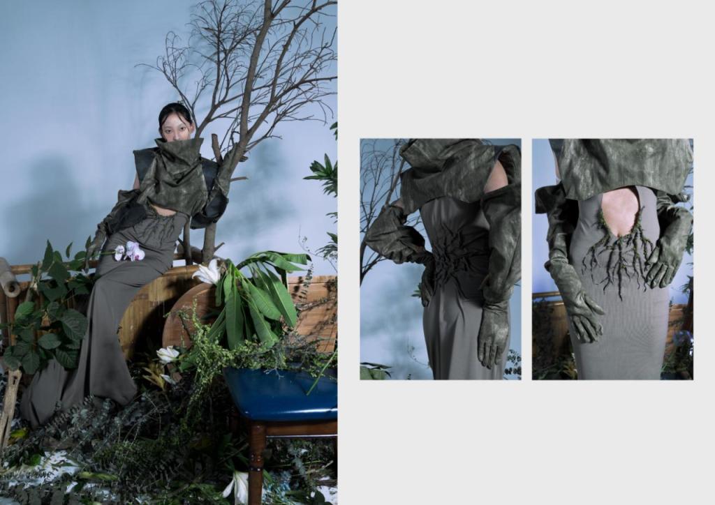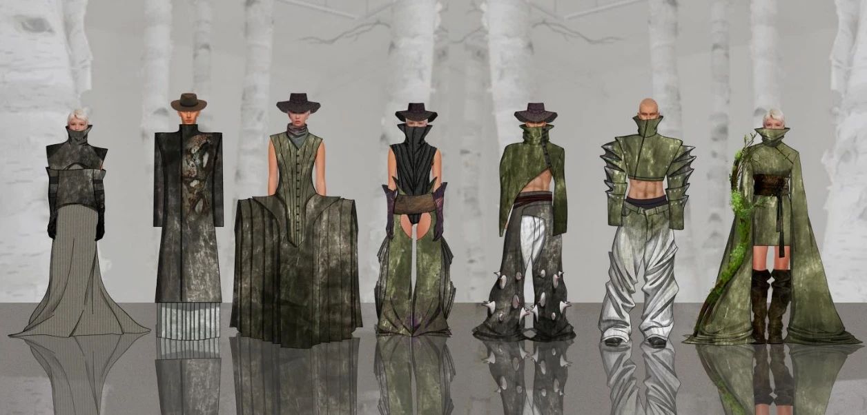 毕业设计的独特之处在于对树木的深入观察和理解。通过细致入微的观察,捕捉出树木形态、纹理和色彩的特点,将树木所代表的生命力和自然美用服装的形式表达出来。从服装的廓形到面料的选择,再到装饰细节的处理,整体设计将自然与时尚巧妙结合,通过这些创新设计,希望能够让大家在我们的服装里感受到树木所蕴含的力量、生命力和美丽,感受人与自然的融合。