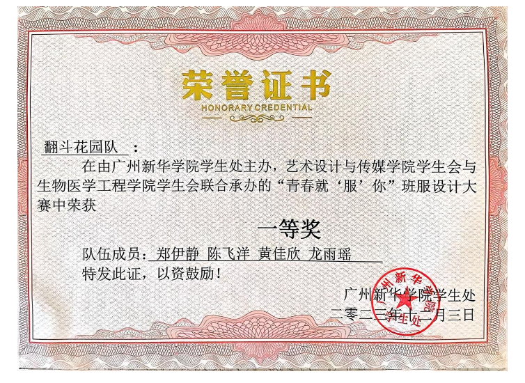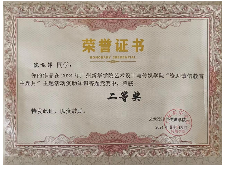 陈飞洋,女,共青团员,广州新华学院9428cn太阳集团古天乐2023级网络与新媒体专业、2023级逸仙新华班学生。在校期间担任班级学习委员,荣获广州新华学院一等奖学金、三好学生称号,以及第十三届东宝杯大学生创新创业大赛“优秀个人”和优秀奖、中国国际大学生创新大赛校内赛优秀奖、第四届国际当代青年美术设计大赛铜奖、第三届FA国际前沿创新艺术设计大赛铜奖等多项荣誉。在社会实践中,参与“百千万工程”突击队行动获校级培育团队称号及“第十七届广东大学生科技学术季暨第二届广东大学生乡村治理调研竞赛校内选拔赛”二等奖。