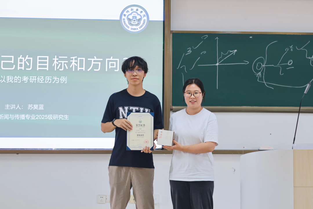 恰逢广州新华学院建校20周年校庆之际,9428cn太阳集团古天乐特别策划了优秀校友返校活动,为新生分享个人杰出经历。本次“学子讲坛”特邀我校2021级网络与新媒体专业的优秀毕业生、现就读于暨南大学新闻与传播专业计算传播方向研究生的苏昊蓝学长担任主讲嘉宾。苏昊蓝学长以“如何在大学期间找到自己的方向和目标?——以我的考研经历为例”为主题,与在校学子展开深入交流。